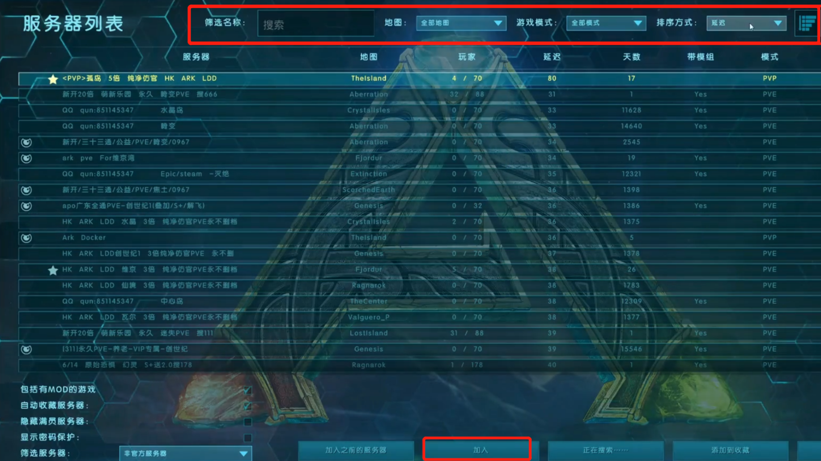 首頁 方舟:生存進化 問答 方舟:生存進化怎麼加入線上伺服器? 2023-01-18 玩家打開游戲後,在游戲界面中點擊【加入線上方舟】即可進入線上伺服器界面,在界面中的上方,玩家可以選擇想要加入房間的地圖或者游戲模式,也可以輸入好友的房間名稱查找房間位置,最後點擊下方的加入即可