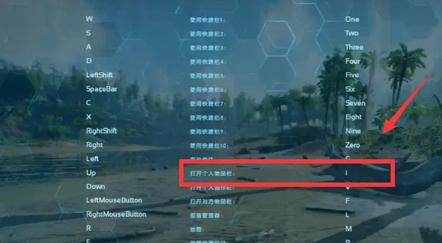 1、方舟生存進化物品欄按i鍵就可以打開。下圖為打開物品欄的快捷鍵。