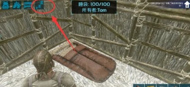 2、然後對著床長按E,就有睡覺的選項,然後點擊「睡覺」按鈕即可。睡袋的話只要靠近並面對睡袋,左上角就會出現操作提示,點擊最右邊的按鈕即可。