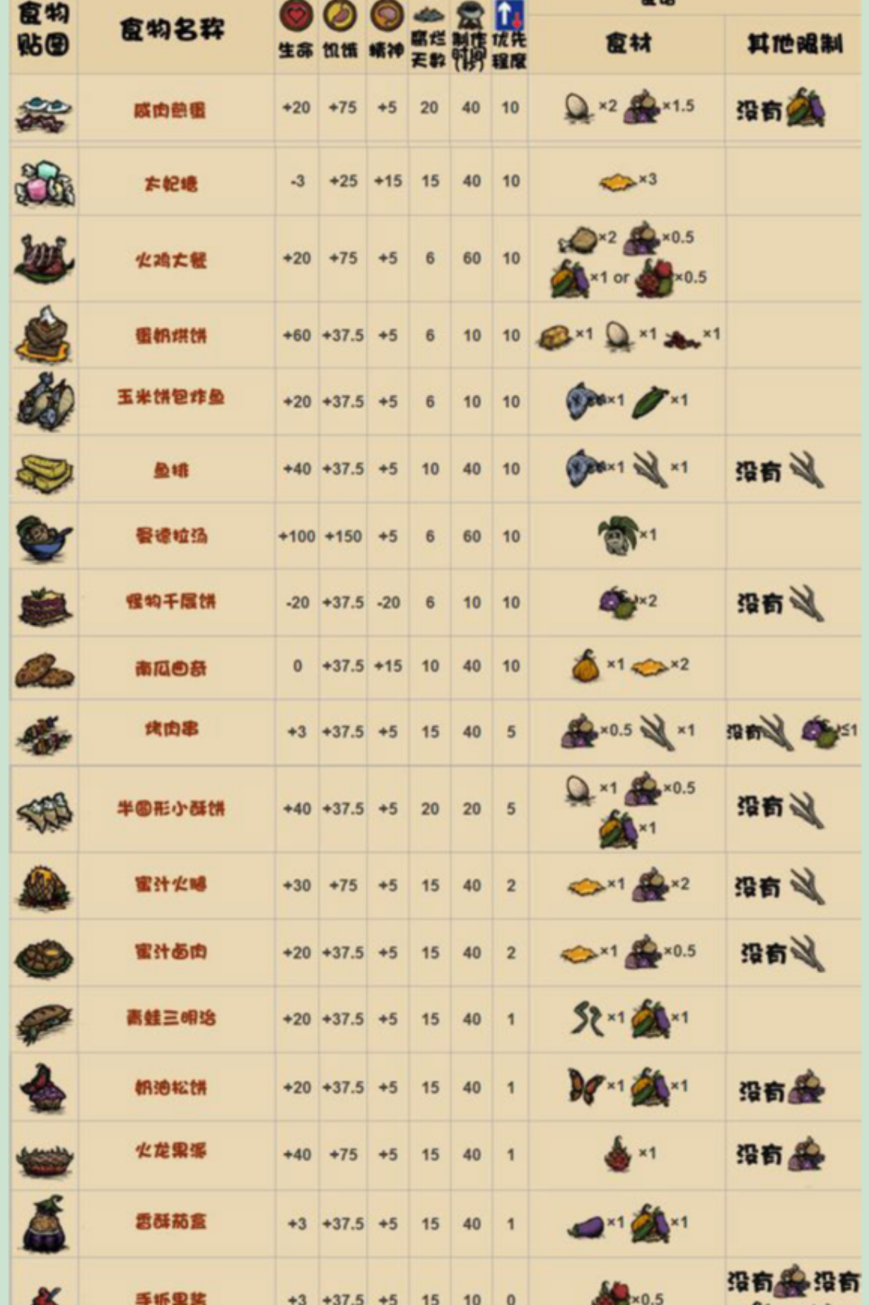 太妃糖、火雞大餐、玉米餅包炸魚、烤肉串、蜜汁火腿、蜜汁滷肉、青蛙三明治、水果狂想曲、大鍋燉肉、南瓜曲奇、半圓形小酥餅。