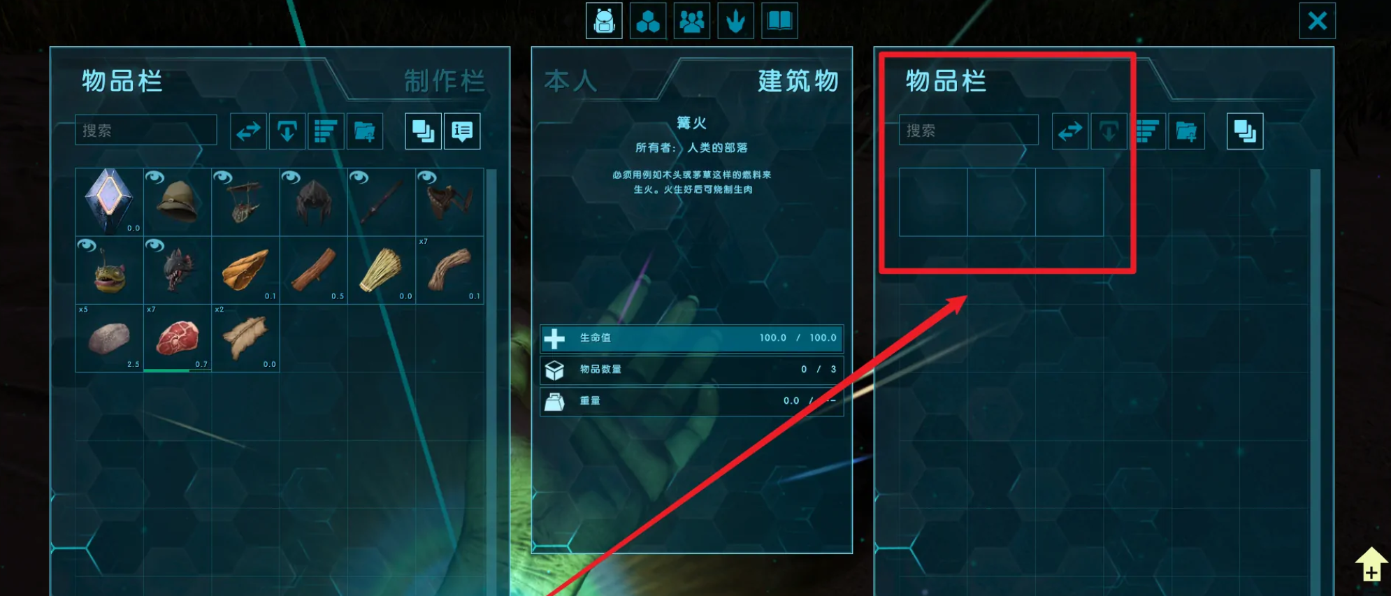 打開物品欄界面後如圖所示,右邊的物品欄中有三個格子,是用來放入點火的材料的,也能夠放入生肉加點火的材料來製作烤肉
