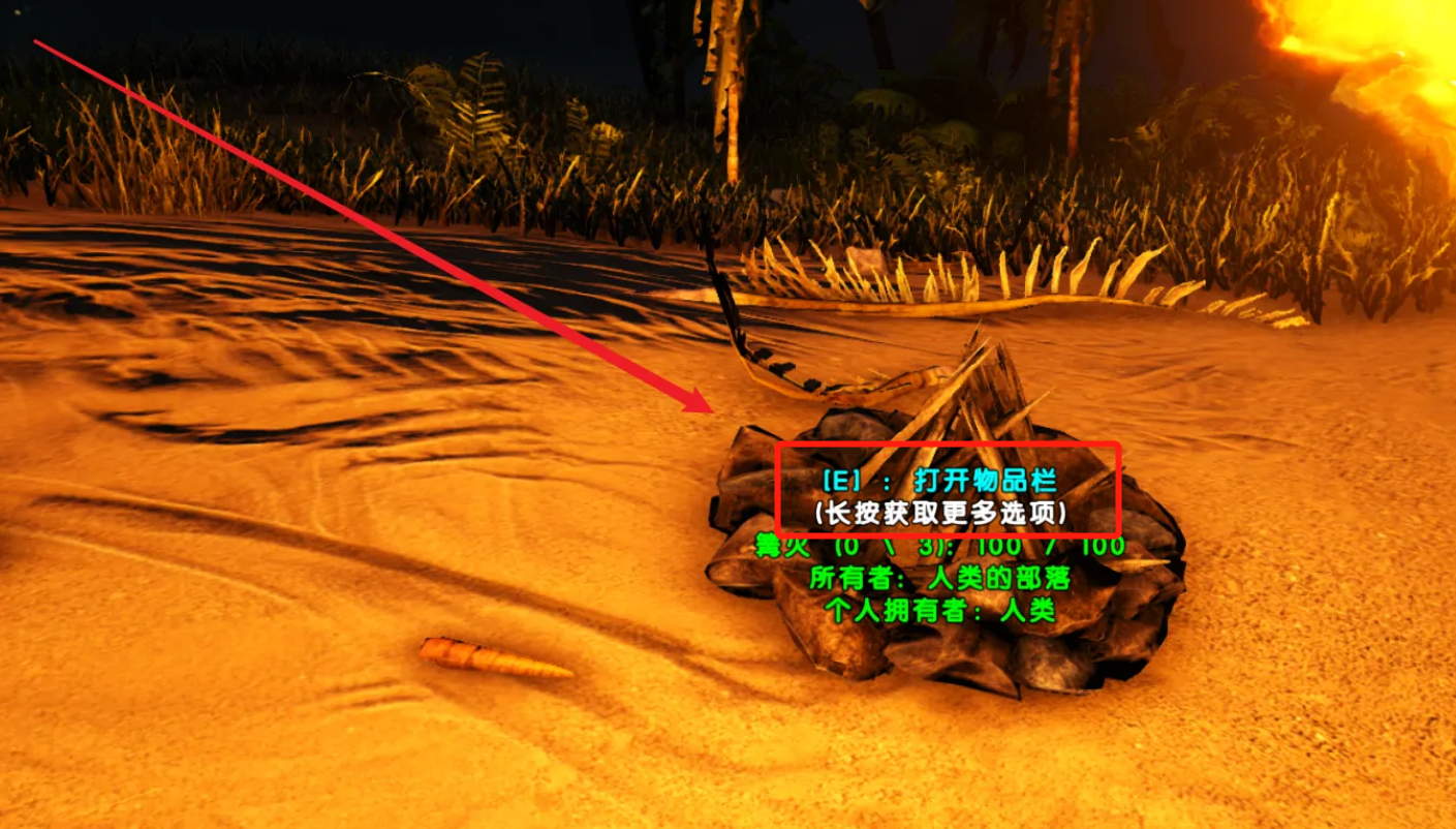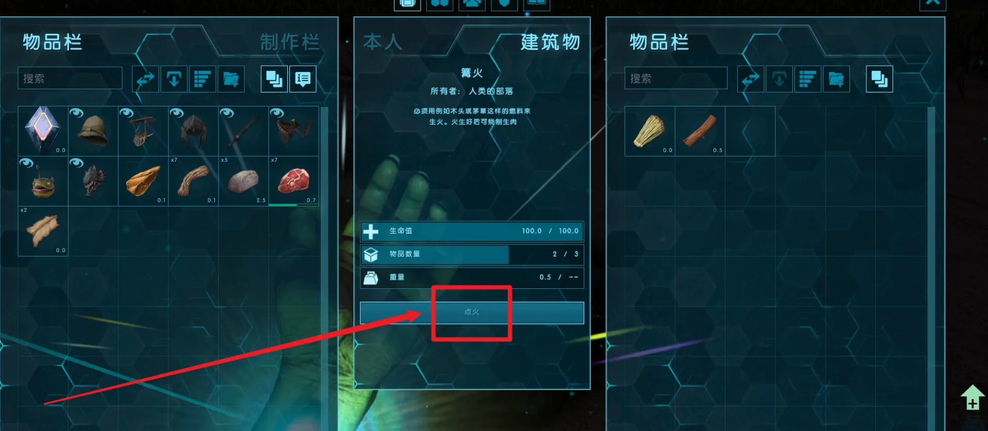 玩家對著已製作好的火堆按下【E】鍵打開物品欄