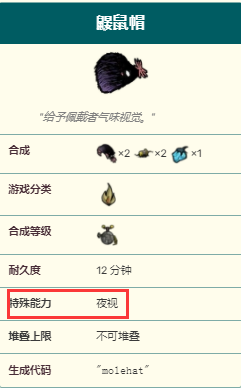首頁 飢荒 問答 饑荒鼴鼠帽有什麼用? 2023-01-25 飢荒鼴鼠帽作用為玩家裝備後可以擁有夜視功能。不像其他光源,鼴鼠帽能讓玩家看清整個屏幕。鼴鼠帽可以使用一天半,但可以用光莓重新充能, 每個可以增加33.3%的耐久。