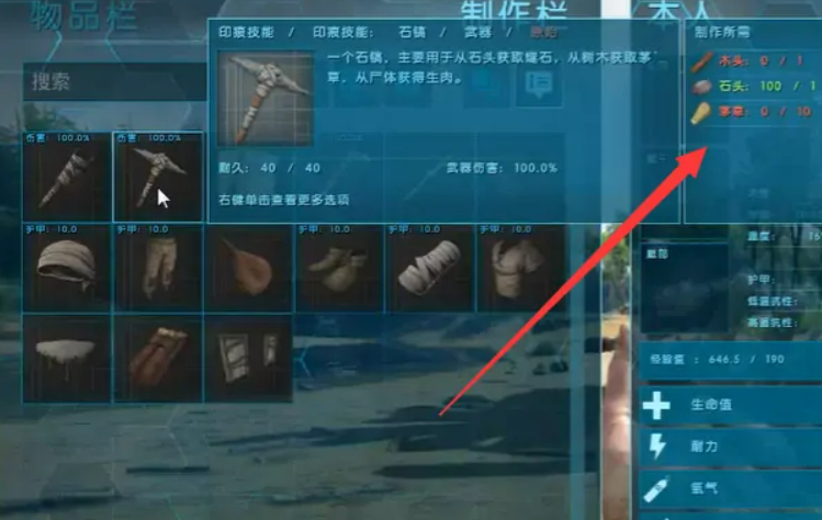 方舟:生存進化游戲中玩家想要製作石鎬的方法如下: