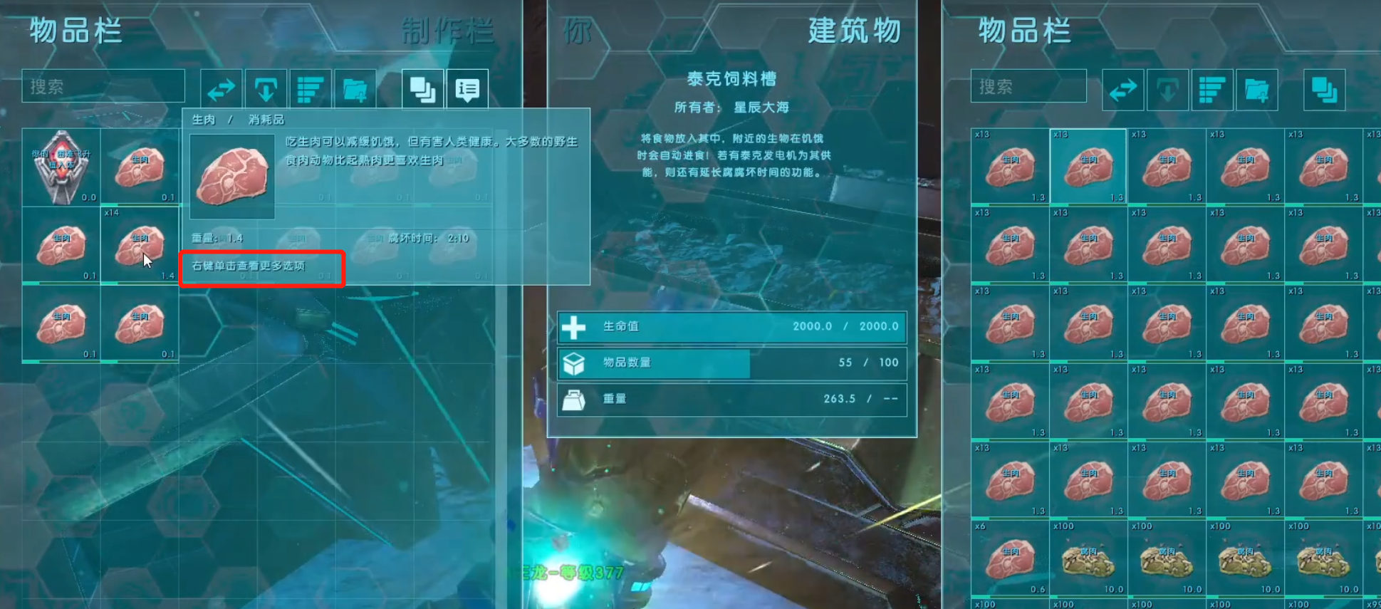 首頁 方舟:生存進化 問答 方舟:生存進化怎麼把肉拆分一個一個的? 2023-01-27 玩家在游戲中打開物品欄,在物品欄中選擇要分開的肉,然後滑鼠右鍵點擊一下查看更多選項點擊之後玩家點擊最下面的拆分堆疊,在這里玩家點擊拆分所有就能夠把肉拆分為一個個的