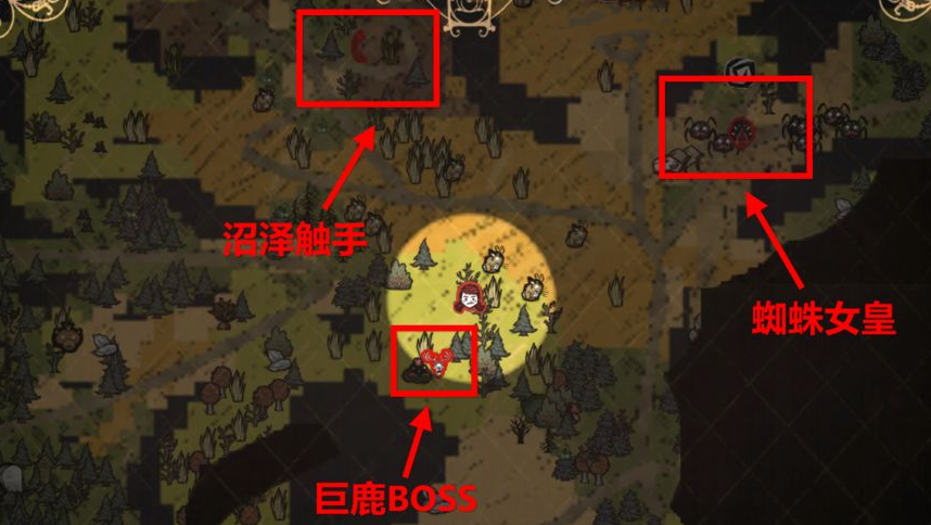 2、巨鹿會出現在玩家附近,這時候需要遠離基地避免巨鹿拆家,一般都是吸引巨鹿到殺傷力比較大的地方,如沼澤、殺人蜂或者蜘蛛巢附近。