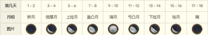 饑荒游戲中,一個完整的月相周期需要16天往復循環,每個月相階段長2個夜晚。第一次滿月為第9天,每次滿月會持續2天。