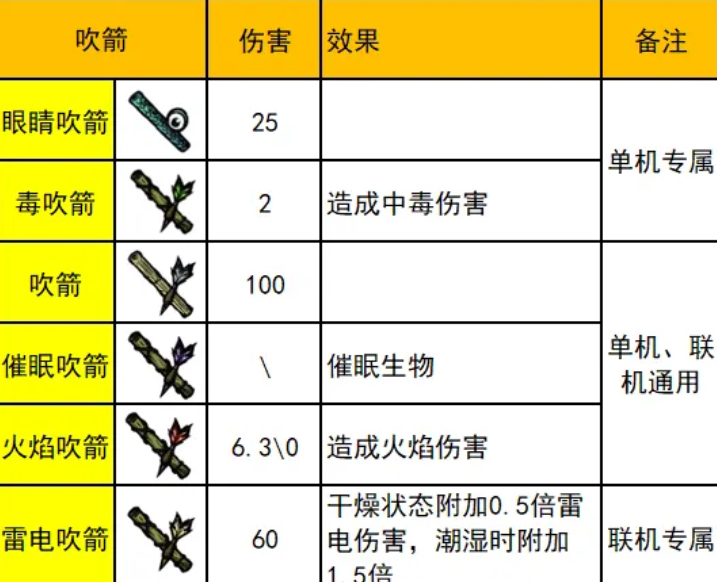 在饑荒之中玩家製作的吹箭每隻吹箭只可以去使用一次而且每次的傷害是100點總的來說傷害是比較高的具體信息如下圖所示