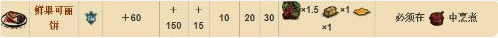 1.鮮果可麗餅:1.5個水果 1個黃油 1個蜂蜜,可以回復60血量、150飢餓度和15腦殘值。