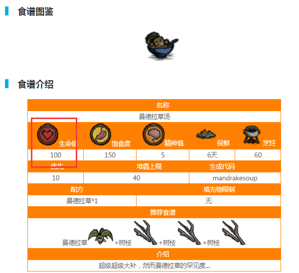 首頁 飢荒 問答 飢荒吃什麼回血最多? 2023-02-02 饑荒食用曼德拉草湯回血最多。曼德拉草湯是一種蔬菜類食物,在烹飪鍋中加入至少 1 個生的曼德拉草(熟的曼德拉草無法放入烹飪鍋)烹飪製作,可回復100血量和150飽食度,是饑荒「大補」的食物。曼德拉草湯屬性如下: