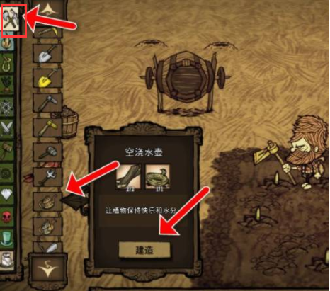 饑荒水壺(空澆水壺)在建造一欄,圖標是斧頭和鎬子,如下圖所示。需要由科學機器解鎖原型體,消耗2塊木板和1條繩子在工具欄中製作。