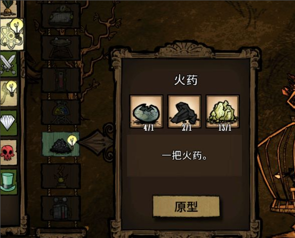 《飢荒》中的火葯在科學那一欄,先要解鎖煉金引擎,也就是二本科技,然後站在煉金引擎旁邊,點開科學那一欄就可以看到火葯的製作了。