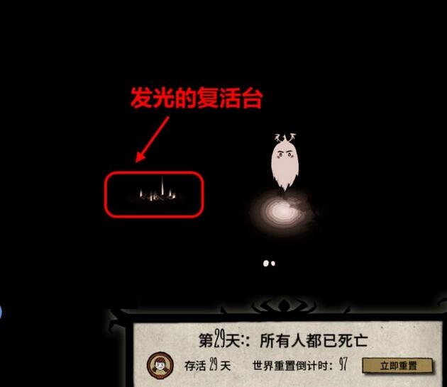 饑荒復活台只可以使用一次,用過之後就會變暗,無法使用第二次,必須尋找新的復活台。例如下圖,發光的復活台,沒有被使用過。
