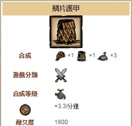 首頁 飢荒 問答 飢荒鱗甲有什麼用? 2023-02-08 在饑荒之中的鱗甲擁有 1800 耐久度並且能吸收 70% 的物理傷害,裝備時每分鐘恢復 3.3 理智,同時玩家可以免疫火焰傷害,而敵人攻擊玩家則會被引燃。