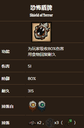 首頁 飢荒 問答 飢荒恐怖盾牌有什麼用? 2023-02-09 恐怖盾牌是手部裝備,既能為玩家提供等同於橄欖球頭盔的80%防禦,又能作為武器攻擊。可以使用食物來回復耐久,回復耐久=|生命值屬性×4| 飢餓值屬性×1.75。