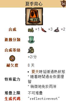 涼爽背心需要1根繩索、3根紅羽毛和2塊豬皮來合成以及科學儀器來解鎖。針線包恢復其62.5%的耐久度。