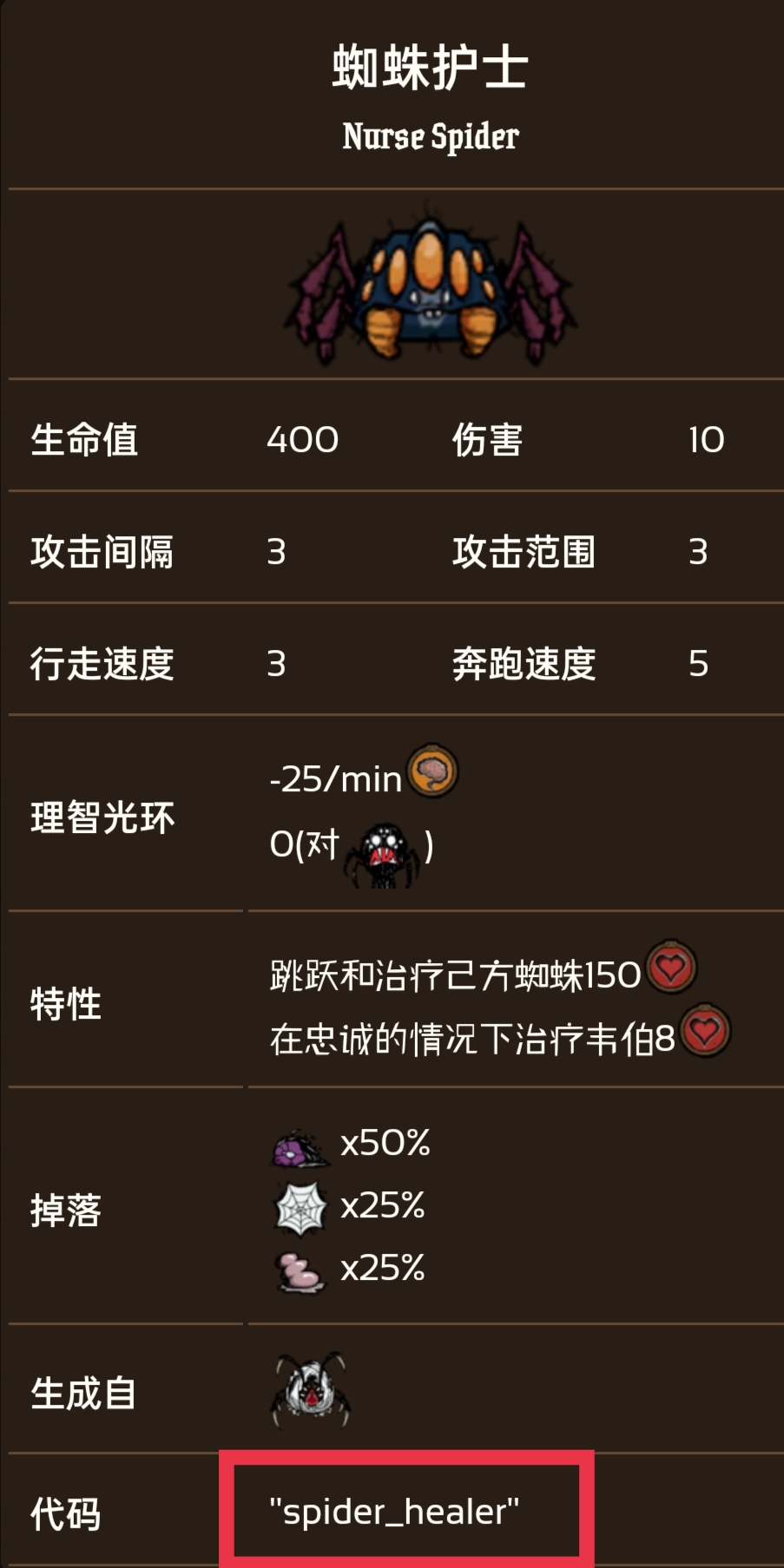首頁 飢荒 問答 飢荒護士蜘蛛代碼是多少? 2023-02-11 在饑荒這款游戲中,蜘蛛護士的代碼是spider healer。蜘蛛護士有獨特的能力,可以定期治療周圍8單位半徑內的所有己方蜘蛛150生命值,有8秒的冷卻時間。