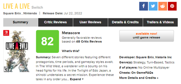 今天(7月22日),Square Enix旗下最新HD-2D復刻JRPG《時空勇士》正式登陸Switch平台,全球媒體也發布了對本作的詳細評分情況;目前在Metacritic上已有48家媒體參與了評價,均分82分。