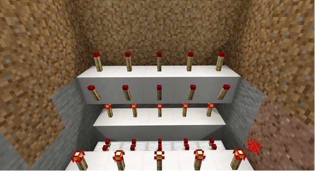 用紅石粉連接每個紅石中繼器,並且順著剛剛挖出來的階梯鋪設到上面。