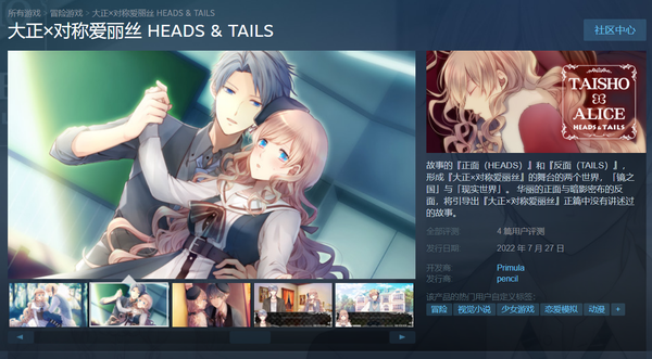 昨日(7月27日),由Primula開發、pencil發行的乙女向文字童話冒險游戲《大正×對稱愛麗絲HEADS & TAILS》正式在上PC(Steam)平台發售,目前該作首發期間購買享9折優惠,售價只需104.4元,支持中文字幕。
