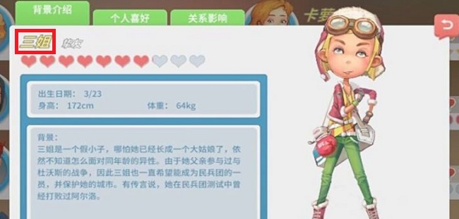 波西亞時光遊戲中三姐喜歡玫瑰花、藍寶石、黃寶石、白玫瑰花、能量石。藍寶石(Sapphire)可以增加五點好感度,黃寶石(Topaz)、白玫瑰花(Asteria)分別可以增加四點好感度,能量石(PowerStone)可以增加三點好感度。