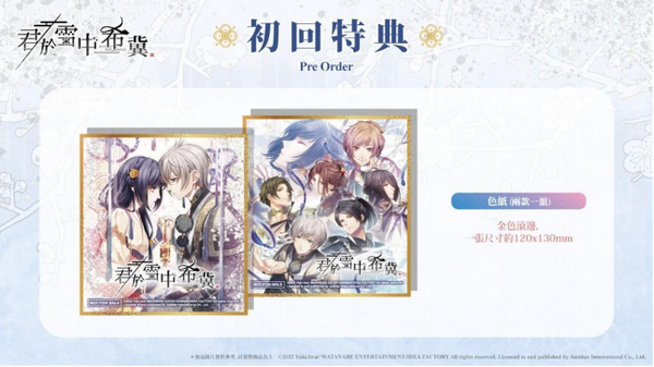 凡購買首批中文版游戲,即可獲得以主視覺圖進行設計的珍藏紀念色紙一組(一組共兩款)。優雅且富色彩層次感的畫面呈現以及厚實好保存的設計,不容易遭到折損,適合擺放於桌面上欣賞。便於您隨時回憶游戲中每一段美好時光。