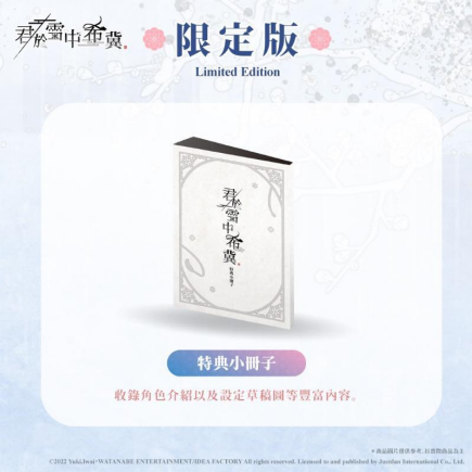 為滿足亞洲廣大乙女游戲粉絲,本次《君於雪中希冀》也將推出獨家豪華升級的亞洲中文限定版,收錄各式各樣玩家們喜愛的珍藏周邊來滿足各位!