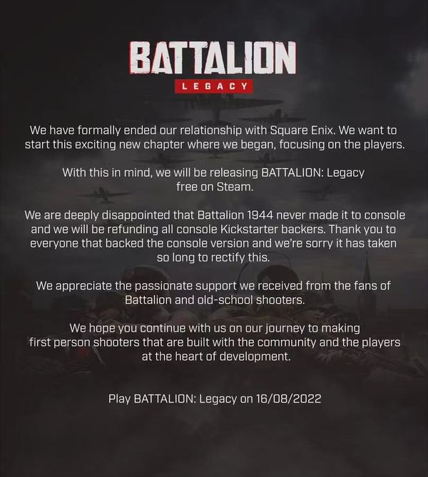 rn 8月9日晚間,曾隸屬於Square Enix旗下的bulkhead工作室發文確認,從即日起,他們已正式和SE結束了一切合作關系。為了迎接這一時刻,官方確認,作為《軍團1944》的最終版游戲《軍團:遺產》將免費發布至Steam平台。rn