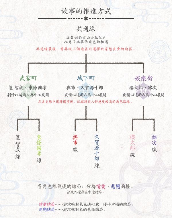 本作共有叄個分歧路線。在共通路線的最後,劇情會提供叄個可負責的區域供玩家進行選擇,叄個地區皆有截然不同的人、事、物以及劇情發展,同時主人公也會邂逅該區域的男主角,並展開知曉愛為何物的物語。