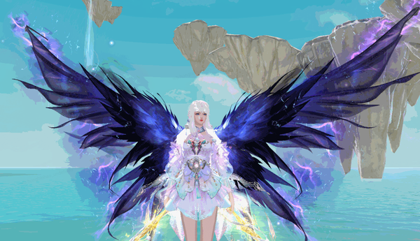 光彩奪目的【瀚海天淵】以清新的淺藍色為主色調,彷彿要與少俠身後那蔚藍的海面融為一體。羽翼根部上,由小巧玲瓏的雲貝和珍珠串聯而成的墜飾伴隨著徐徐清風而舞動,說不定還能聽到海浪的聲音呢?羽翼輕輕揮動,絢麗流光便如同水波一般從翼間傾瀉而出,仍存留於初秋的熱浪彷彿都被這水花擊退了。少俠若換上這身羽翼,定能吸引住所有人的目光吧!