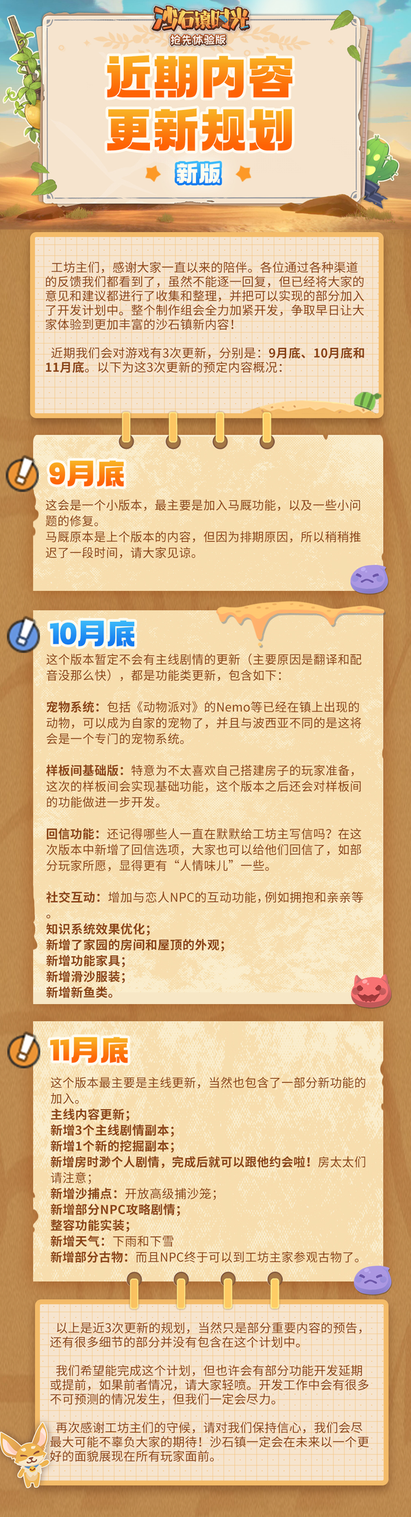 另一方面,在完成了9月初的主線劇情更新之後,《沙石鎮時光》項目組也公布了新的更新計劃:根據介紹,玩家們呼聲較高的馬廄功能將在本月月底加入,而在10月的更新中,《沙石鎮時光》也將加入樣板房、寵物系統、社交互動等大量功能性更新。除此之外,在11月時本作的主線也將加入全新的劇情主線和天氣系統。相信隨著遊戲的不斷更新,本款遊戲內容也將變得更加完善豐滿。