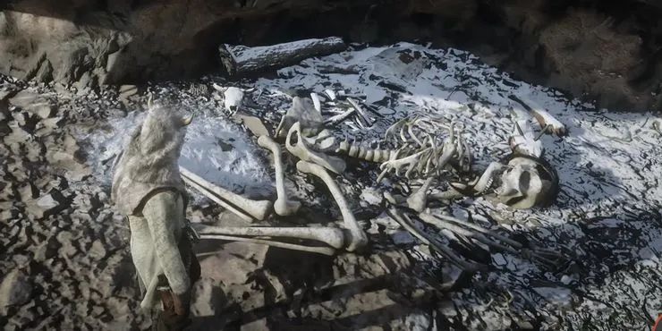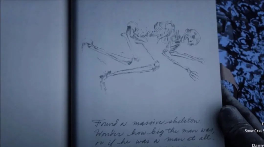 在《荒野大鏢客2》中也是如此。在地圖上找到肖恩山,沿著道路一直爬到山頂,在一塊巨大的岩石下面就可以找到大腳怪的骸骨。亞瑟自己的素描記載:發現了一具巨大的骸骨,如果這是個人的話,該有多大塊頭。