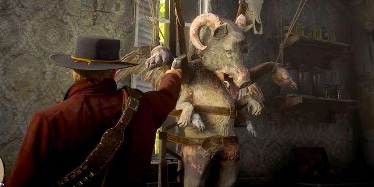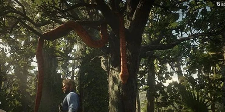 現在,這樣場景有了遊戲重拍版本。如果你在《荒野大鏢客2》中探索萊莫因附近的森林河口,很有可能會遇到吊在樹上的巨蟒,場景跟電影中非常像。只不過這些巨蟒都死了,用槍射擊也沒有反應。