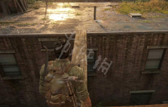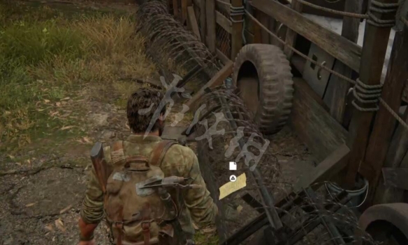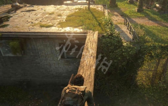 從房頂拿起木板搭橋,就能進入鐵絲網內部了。
