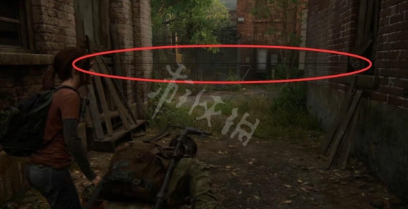 右邊下去小心小屋裡有循聲者,中間上樓梯進入房子搜刮。左邊下去有個【隱藏門】,然後發現一旁的鐵絲網門打不開。