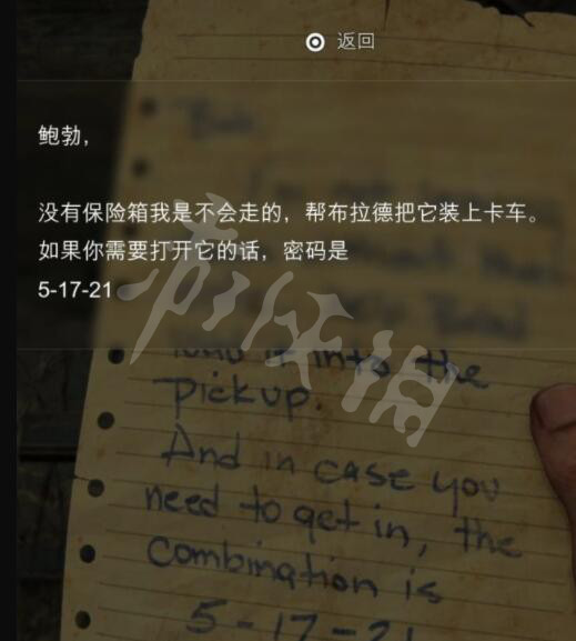 順著街道往下走,路邊有個【保險箱】,密碼在前面能撿到。
