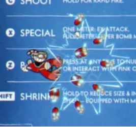極其雞肋,格擋可以對其他不是粉色的小怪和BOSS造成傷害,但對於敵人的子彈無法格擋,第二次跳躍後還不能使用,在海邊普通關卡(第三世界的危險的橋墩perilous piers)有很大用處。