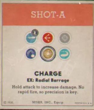 普通子彈(充能彈):充能爆炸子彈,直接開火傷害大概為1.25,威力一般(太細了)。蓄滿後傷害高范圍廣(三發教小boss做人),蓄力時衝刺會自動發射。適合打攻擊頻率快的BOSS和密集的小怪。