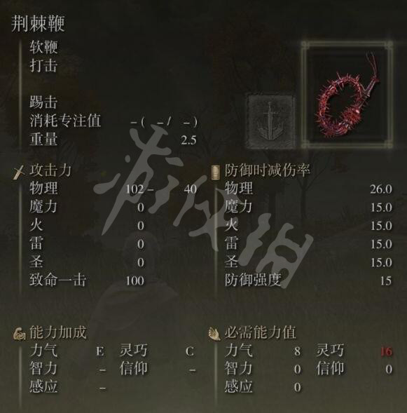 從賜福出發離開墓地,消滅下圖標記出的敵人後有幾率掉落荊棘鞭。