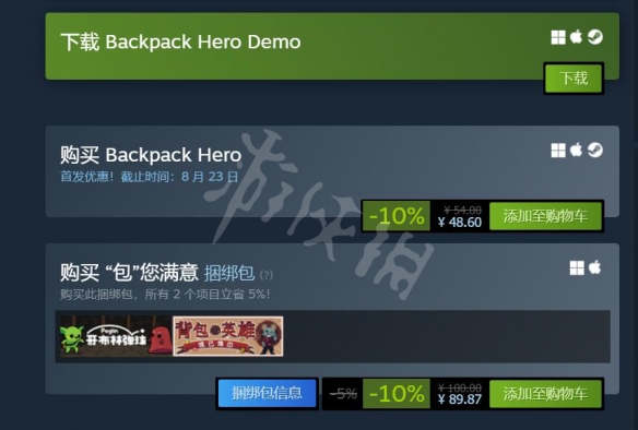 以上就是背包英雄steam售價介紹的內容了,更多遊戲相關資訊攻略請關注,我們將會第一時間更新最全的內容幫助大家了解該遊戲,一起來看一下吧。