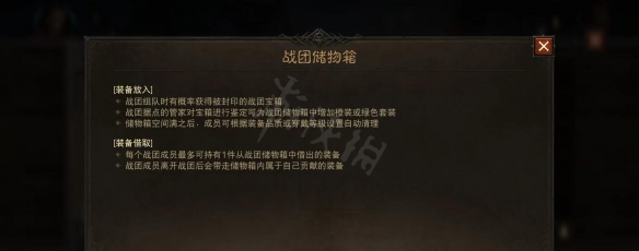 值得一提的是,戰團寶箱的裝備有可能高於掉落玩家的等級,也可能與掉落玩家的職業無關,而且一定要先存入戰團寶箱,才能再借出使用。