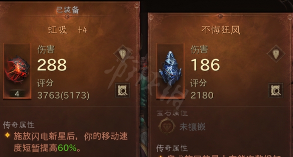 我們來看下面這2張對比圖,以法師的副手武器為例,只看屬性的話,無論是傷害,還是加成屬性、魔法屬性都是【虹吸】最好。假如你只想要【不悔狂風】的傳奇屬性奧術旋風特效,那怎麼辦呢?通過精華傳承就可以搞定!