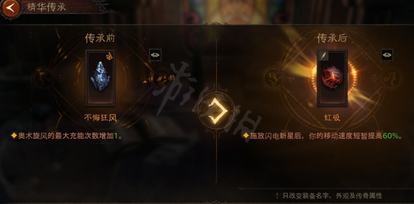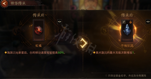 精華傳承後的結果如下圖,原先裝備的名字、外觀、傳奇屬性都變了,而且裝備圖標多了一個傳承標誌。在裝備的詳細面板里點擊這個傳承標誌還可以查看原始裝備的傳奇屬性。