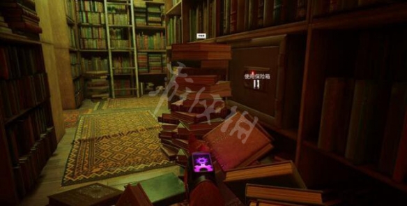 然後在這個小型的圖書室的中排區域,趟過一片書堆,發現隱秘的保險箱,使用獲得的鑰匙打開保險箱,獲得Doc的筆記。