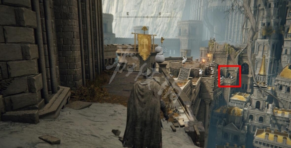 出門左轉沿著城牆前進,從前方下圖標記出來的小門中進入房間。