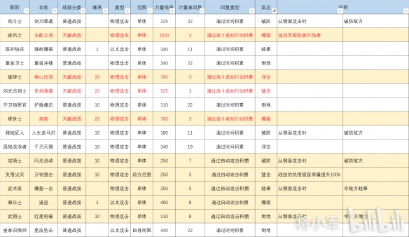 白色填充為科維斯戰技,黃色填充為安格努斯戰技,紅色字體為天賦戰技。