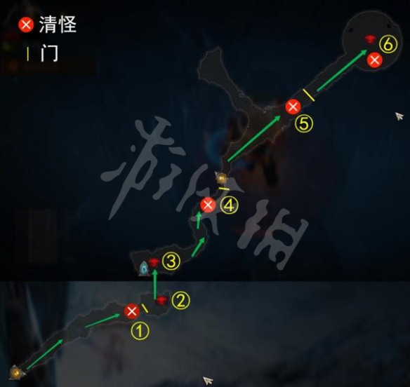 ①清掉兩只白熊→②打冰洞老一→③老一掀桌,繼續打二階段→④清掉小怪踢開冰柱→⑤清掉小怪打開大門→⑥清掉小怪,打冰洞老二,結束副本。