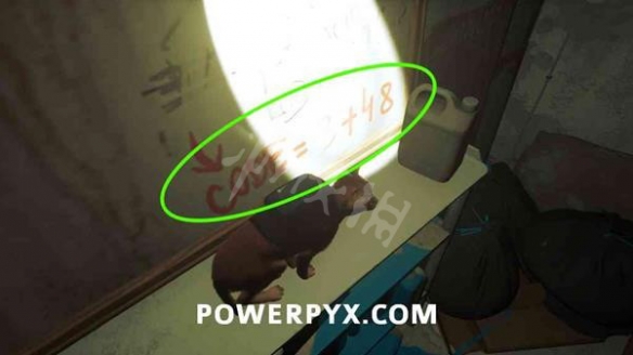 進入大門旁邊的儲藏室,爬上架子,打開手電筒筒照向白板,即可看到紅色字體"CODE=3748" ,這就是開門密碼。