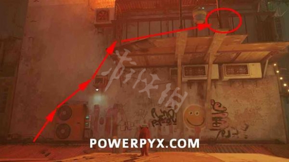轉身跳到右邊的售貨機上,然後沿著牆邊的平台走。