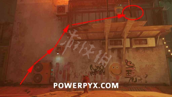 從你與Guardian交談的地方,轉身向右看。您可以跳過房屋牆壁上的自動售貨機和空調裝置以到達屋項。